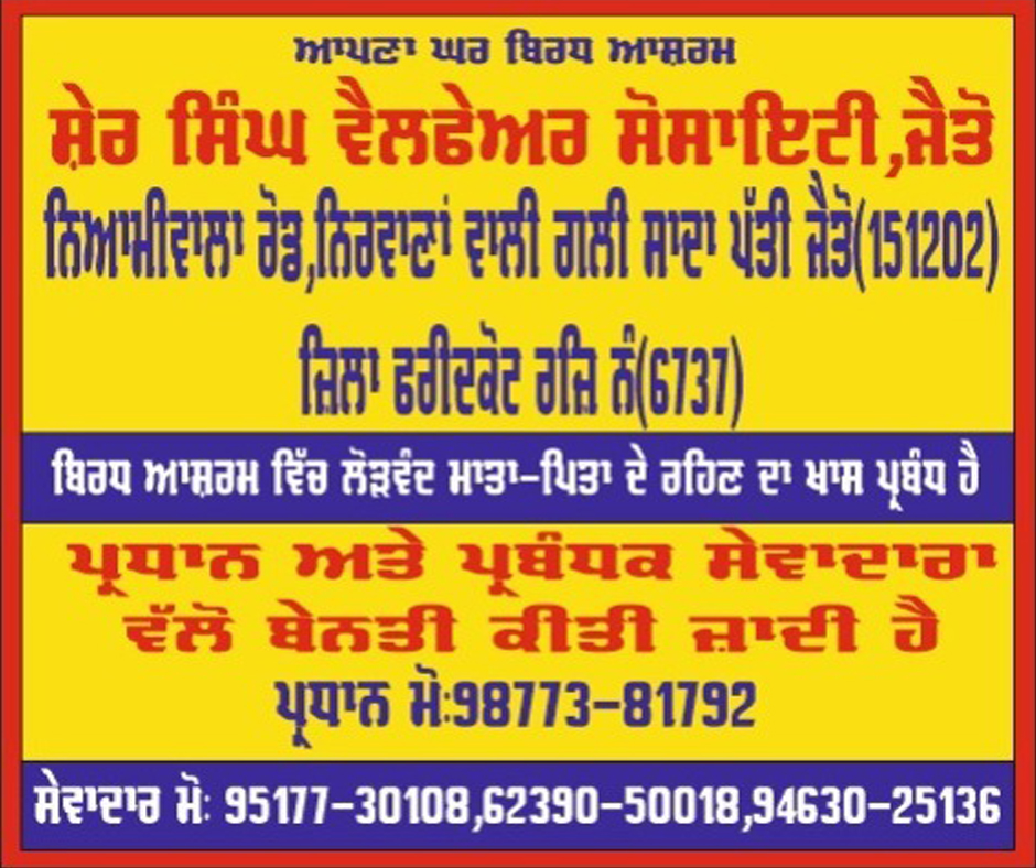 ਨਾਮ: ਅਪਣਾ ਘਰ ਬ੍ਰਿਧ ਆਸ਼ਰਮ (ਸ਼ੇਰ ਸਿੰਘ ਵੈਲਫੇਅਰ ਸੋਸਾਇਟੀ)